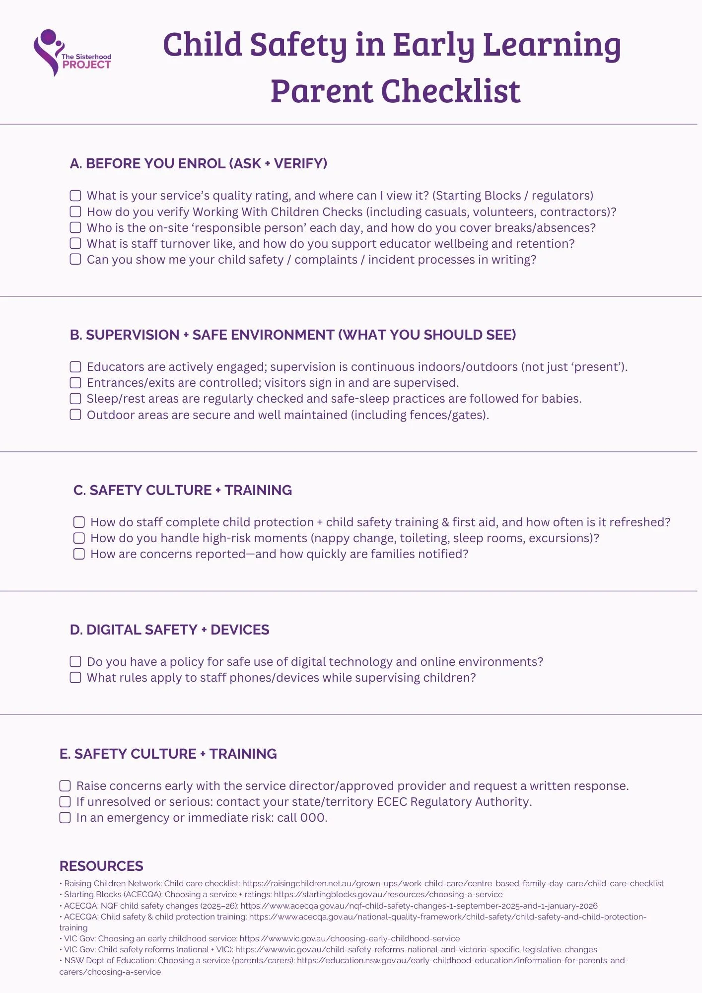 We’ve created a 1-page Parent Child Safety Checklist that brings together guidance from Raising Children Network, ACECQA/Starting Blocks and updated child safety legislation all in plain language.
